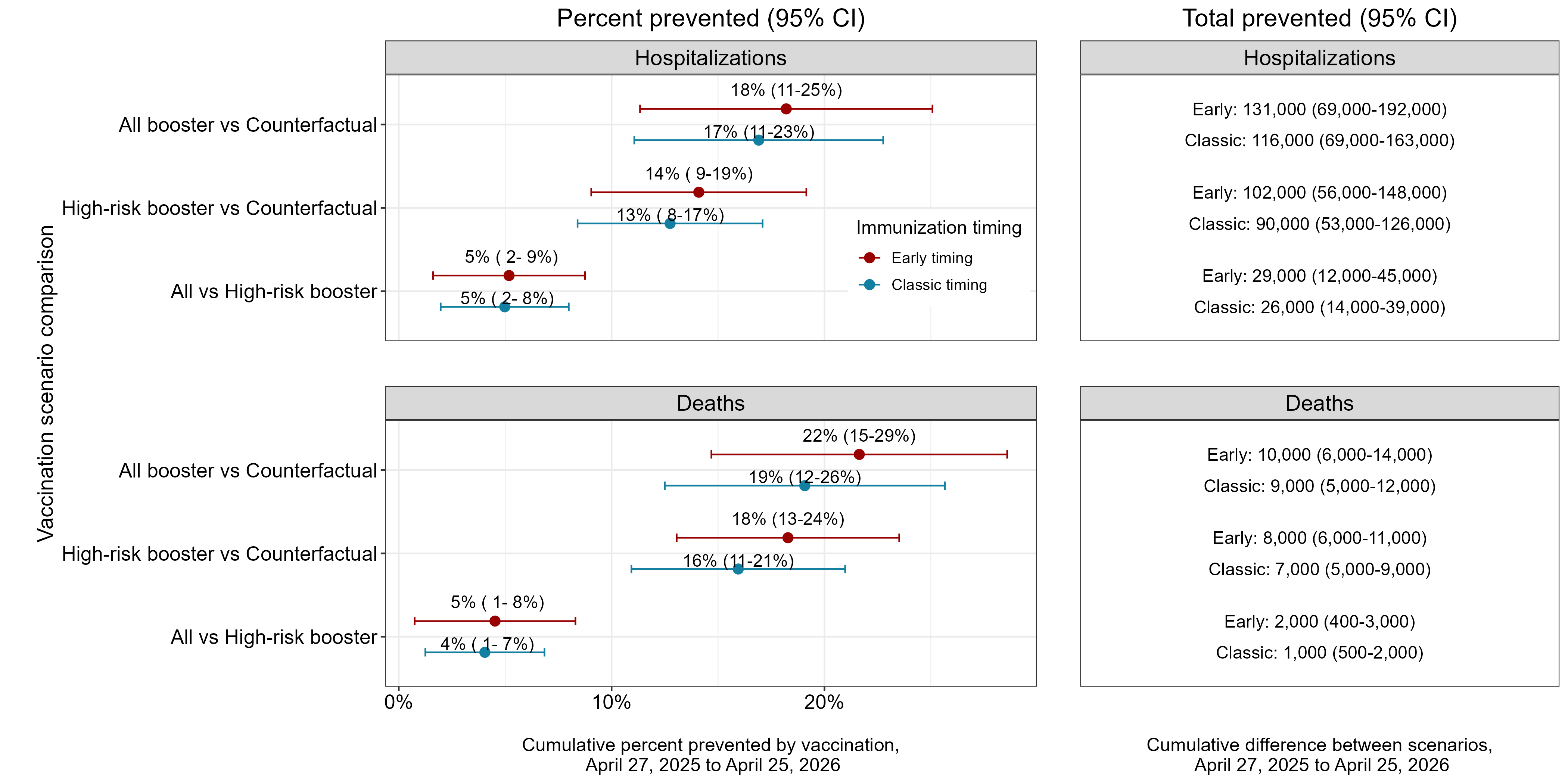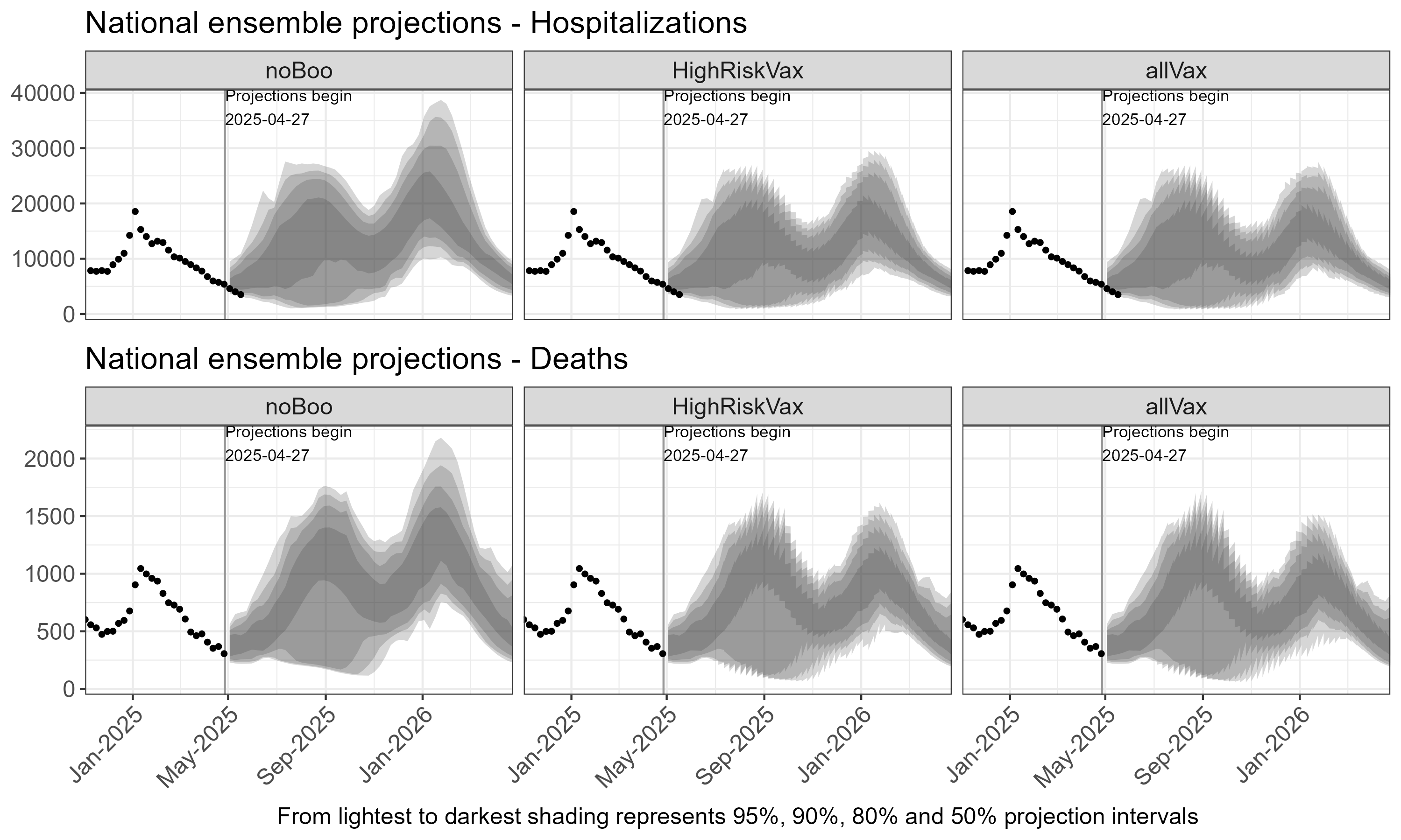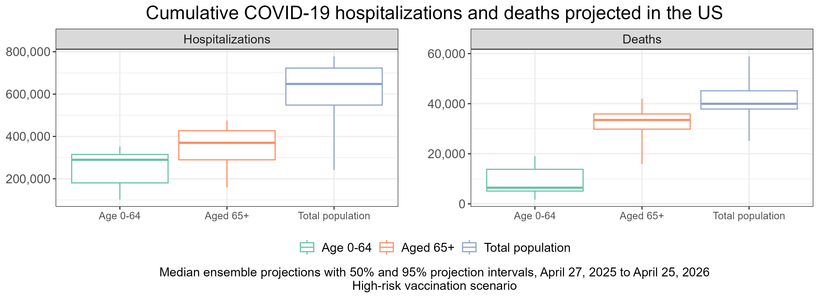 - Among all scenarios, continued substantial burden of disease from COVID-19 is expected, with 648,000 cumulative hospitalizations (95% PI 241,000–778,000) and 40,000 deaths (95% PI 25,000-59,000) due to COVID-19 projected over the course of the projection period (April 27, 2025 to April 25, 2026) in the high risk group scenario (i.e., booster vaccination only among individuals aged 65+ or otherwise at high risk for elevated severity).