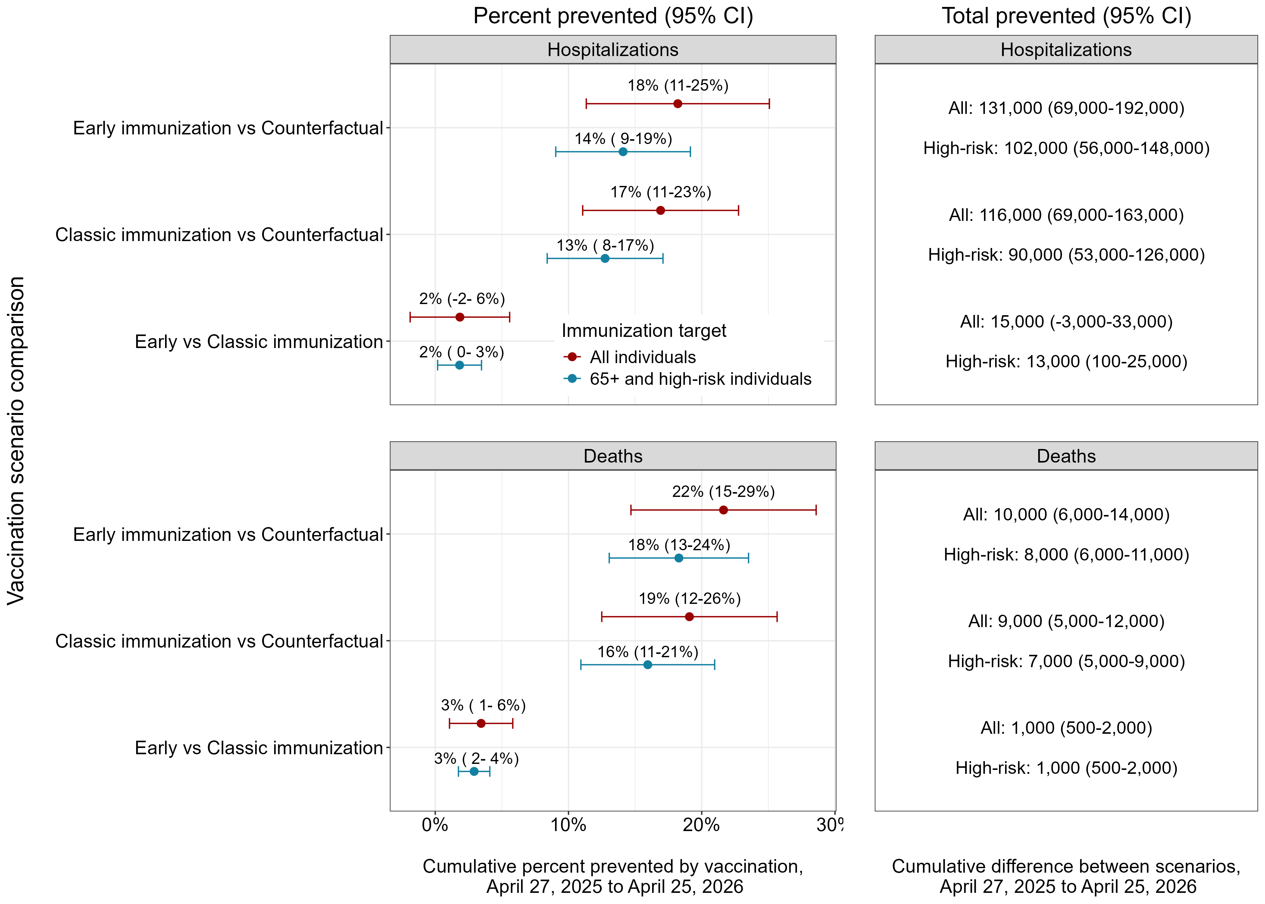 - The majority of the overall vaccination benefits (i.e., direct and indirect effects) is expected to come from reductions in this age group, with 67,000 (38,000-96,000) hospitalizations and 6,000 (4,000-7,000) deaths averted among 65+ individuals in the high-risk group recommendation scenario compared to no vaccination.